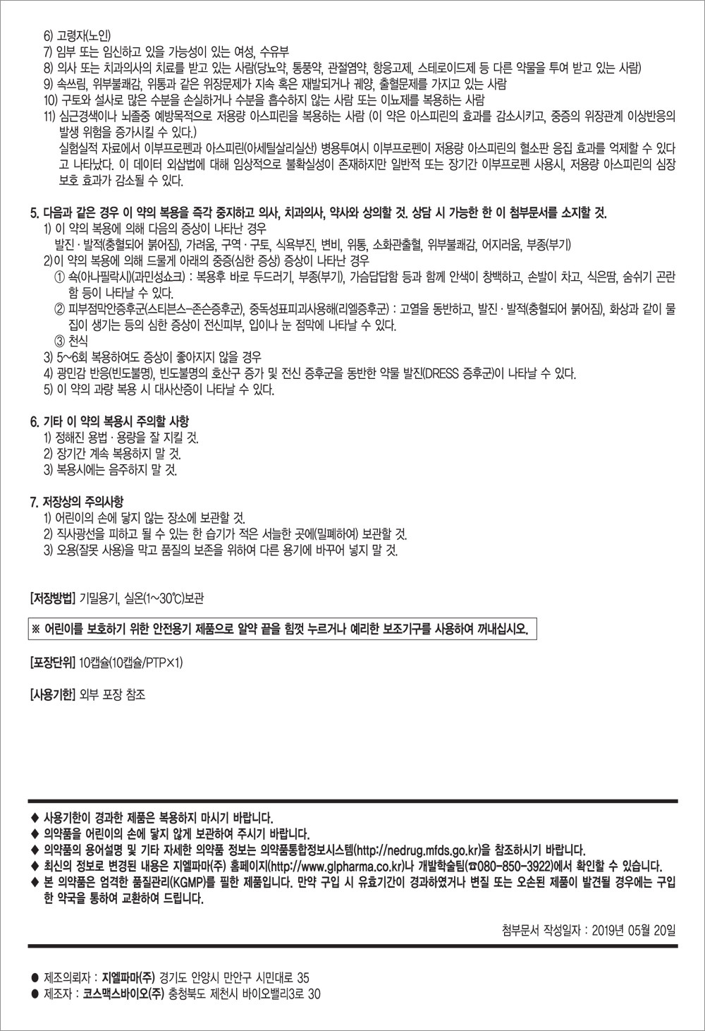 11) 심근경색이나 뇌졸중 예방목적으로 저용량 아스피린을 복용하는 사람(이 약은 아스피린의 효과를 감소시키고 중증의 위장관계 이상반응의 발생 위험을 증가시킬 수 있다.) 실험실적 자료에서 이부프로펜과 아스피린(아세틸살리실산) 병용투여시 이부프로펜이 저용량 아스피린의 혈소판 응집 효과를 억제할 수 있다고 나타났다. 이 데이터 외삽법에 대해 임상적으로 불확실성이 존재하지만 일반적 또는 장기간 이부프로펜 사용시 저용량 아스피린의 심장 보호 효과가 감소될 수 있다.
