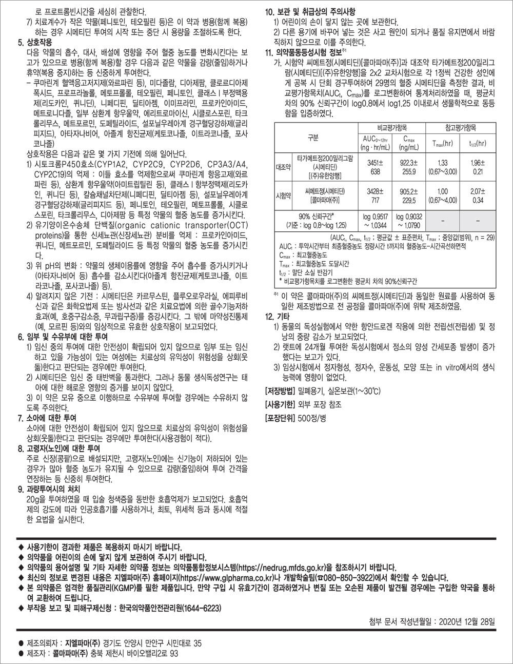 02) 의약품동등성시험기준 제7조제2항에 따라, 시험약 시메티딘정200밀리그램(크라운제약(주))은 대조약 시메티딘정400밀리그램(크라운제약(주))과의 비교용출시험자료를 제출하였으며 대조약과 용출양상이 동등하였다. 이에 따라 해당 자료로서 생물학적동등성을 입증하였다.