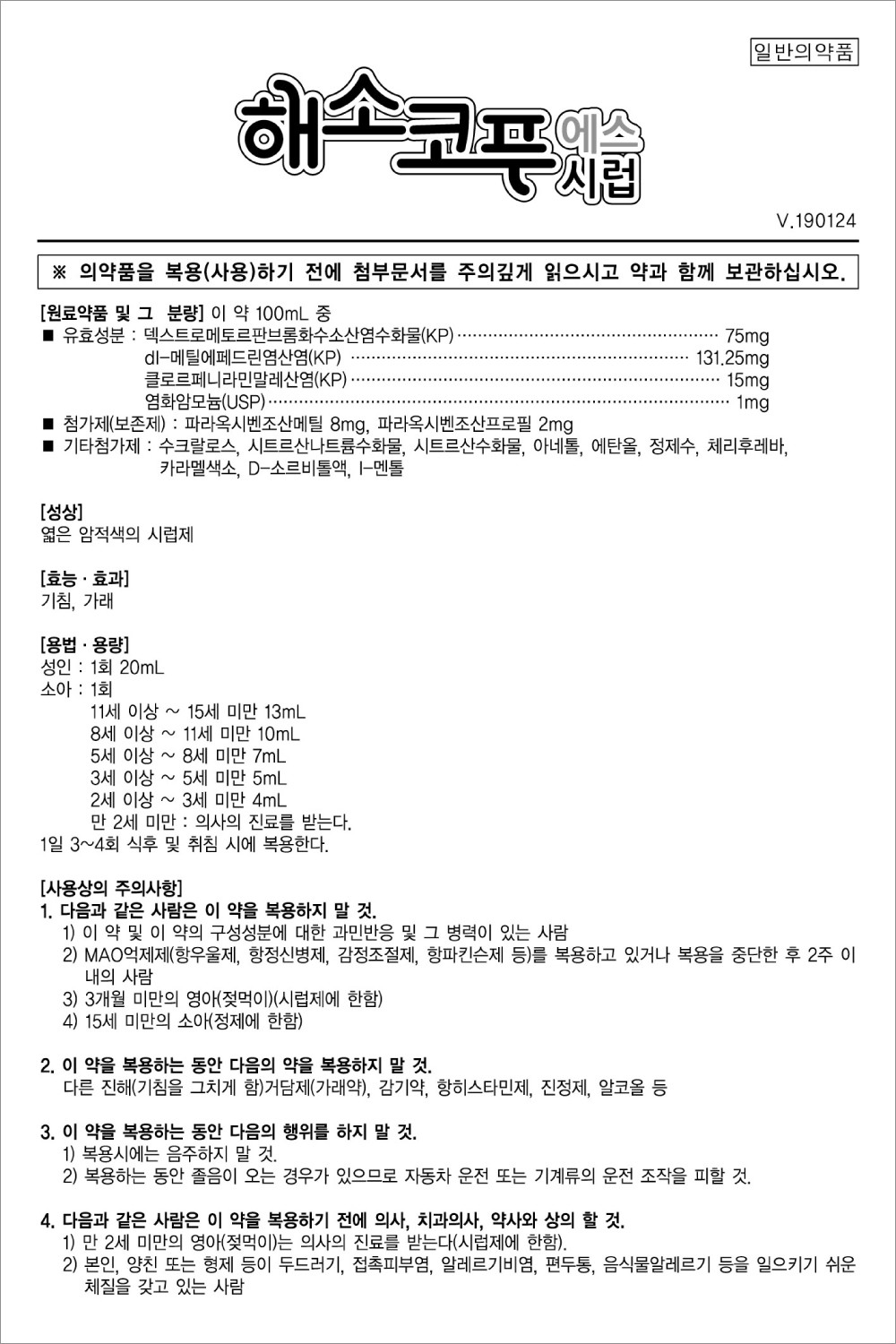 덱스트로메토르판브롬화수소산염수화물 75mg/100ml, 클로르페니라민말레산염 15mg/100ml, 염화암모늄 1000mg/100ml, DL-메틸에페드린염산염 131.25mg/100ml