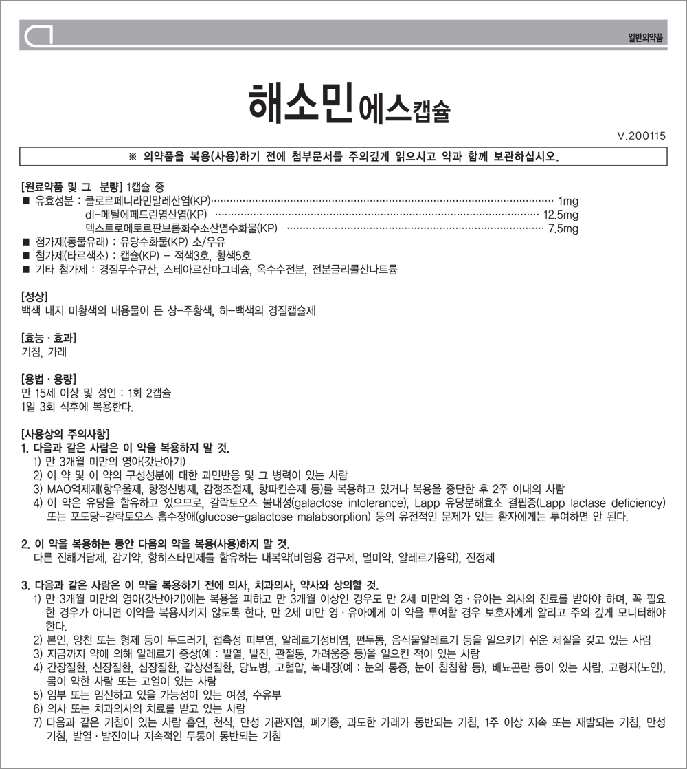 DL-메틸에페드린염산염 12.5mg, 덱스트로메토르판브롬화수소산염수화물 7.5mg, 클로르페니라민말레산염 1mg