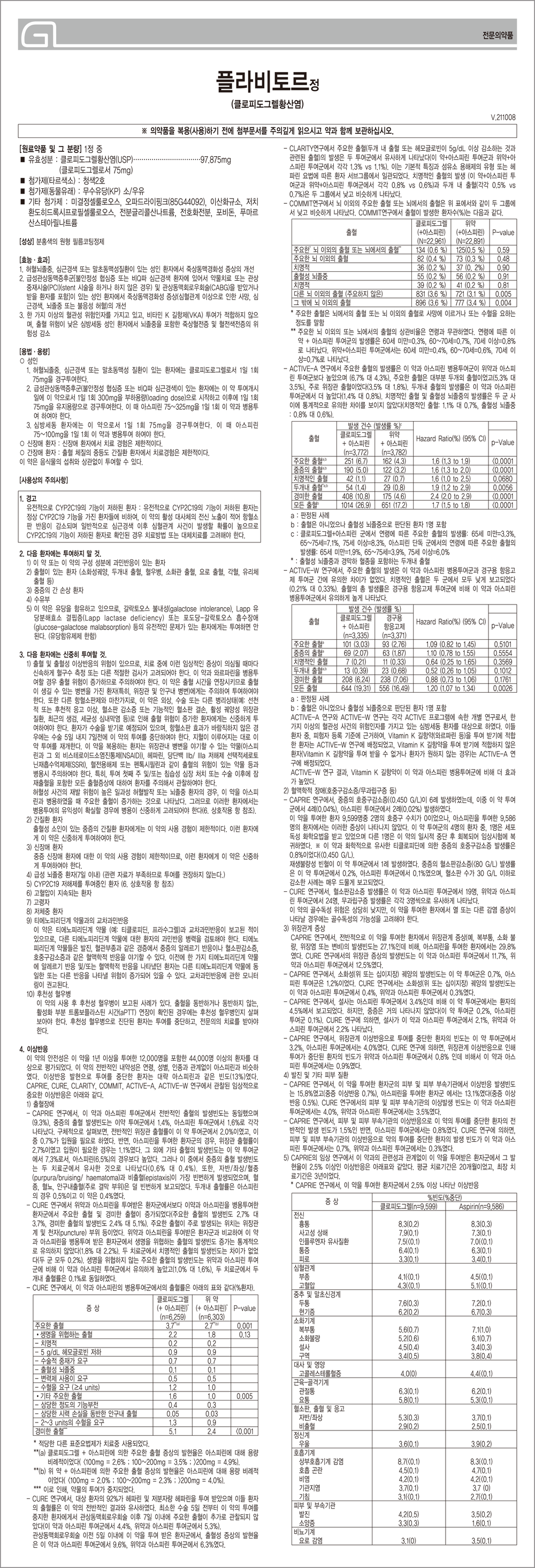 이 약의 안전성은 이 약을 1년 이상을 투여한 12,000명을 포함한 44,000명 이상의 환자를 대상으로 평가되었다. 이 약의 전반적인 내약성은 연령, 성별, 인종과 관계없이 아스피린과 비슷하였다. 이상반응 발현으로 투여를 중단한 환자는 대략 아스피린과 같은 빈도 (13%)였다. CAPRIE, CURE, CLARITY, COMMIT, ACTIVE-A, ACTIVE-W 연구에서 관찰된 임상적으로 중요한 이상반응은 아래와 같다.