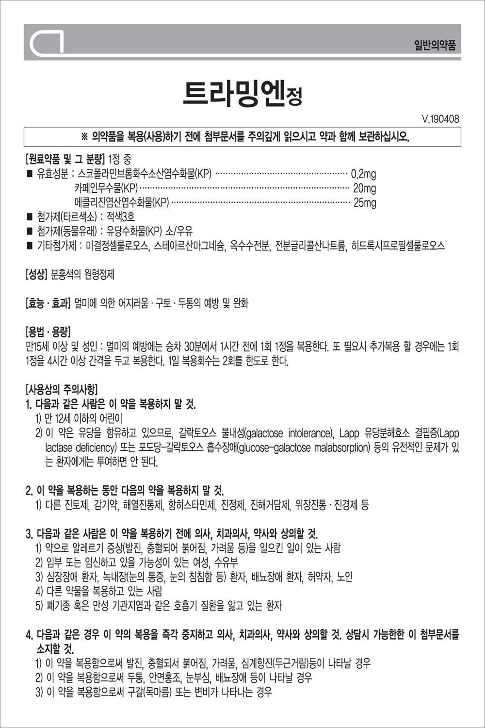 메클리진염산염수화물 25mg, 브롬화수소산스코폴라민 0.2mg, 카페인무수물 20mg