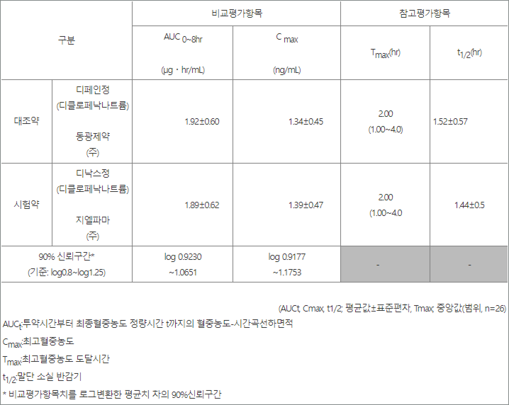가. 시험약 디낙스정(디클로페낙나트륨)[지엘파마(주)]와 대조약 디페인정(디클로페낙나트륨)[동광제약(주)]을 2x2 교차시험으로 각 1정씩 건강한 성인에게 공복 시 단회 경구 투여하여 26명의 혈중 디클로페낙을 측정한 결과 비교평가항목치(AUCt, Cmax)를 로그변환하여 통계처리 하였을 때 평균치 차의 90% 신뢰구간이 log0.8에서 log1.25 이내로서 생물학적으로 동등함을 입증하였다.