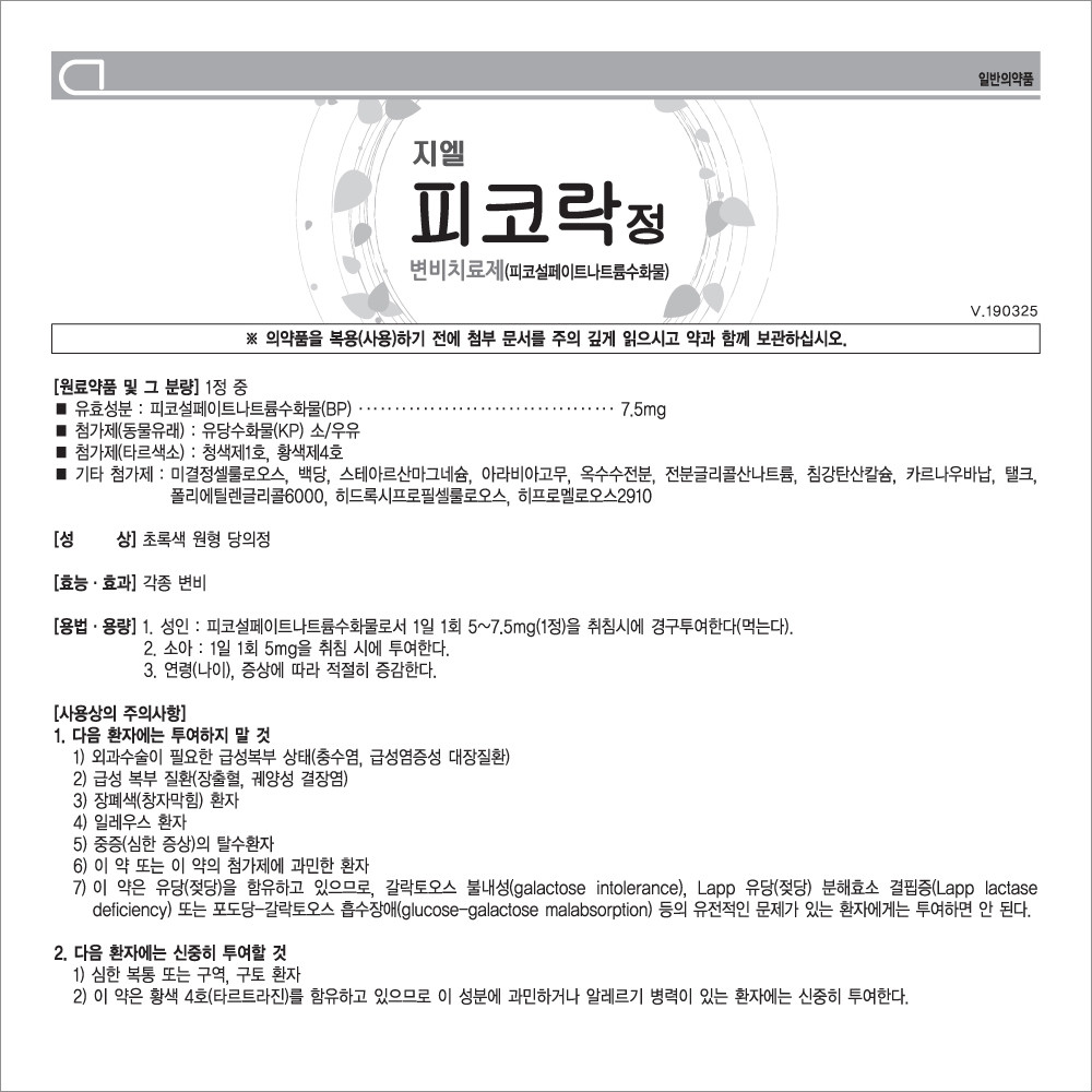 01. 성인 : 피코황산나트륨으로서 1일 1회 5 - 7.5mg을 취침시에 경구투여한다.