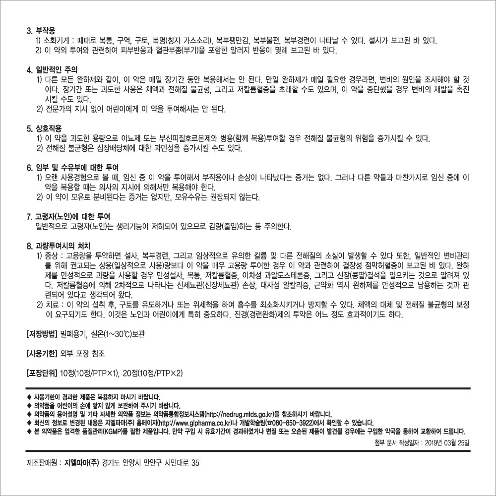 01) 다른 모든 완하제와 같이 이 약은 매일 장기간 동안 복용해서는 안된다. 만일 완하제가 매일 필요한 경우라면 변비의 원인을 조사해야 할 것이다. 장기간 또는 과도한 사용은 체액과 전해질 분균형 그리고 저칼륨혈증을 초래할 수도 있으며 이 약을 중단했을 경우 변비의 재발을 촉진시킬 수도 있다.