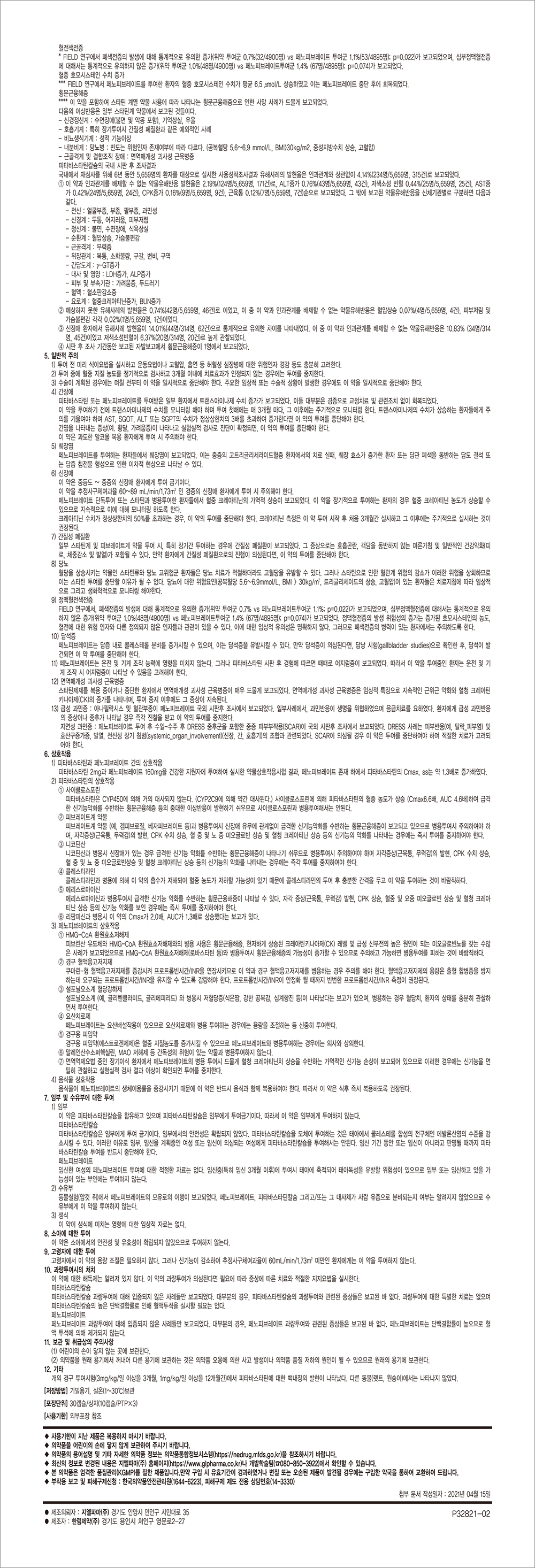 01) 피타바스타틴과 페노피브레이트 간의 상호작용 : 피타바스타틴 2mg과 페노피브레이트 160mg을 건강한 지원자에 투여하여 실시한 약물상호작용시험 결과 페노피브레이트 존재 하에서 피타바스타틴의 Cmax, ss는 약 1.3배로 증가하였다.