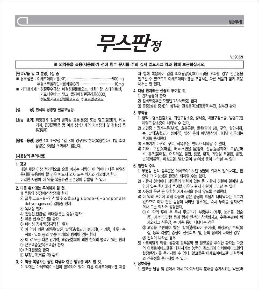 이 약에는 아세트아미노펜이 함유되어 있다. 다른 아세트아미노펜 제품과 함께 복용하여 일일 최대용량(4,000mg)을 초과할 경우 간손상을 일으킬 수 있으므로 아세트아미노펜을 포함하는 다른 제품과 함께 복용해서는 안 된다.
