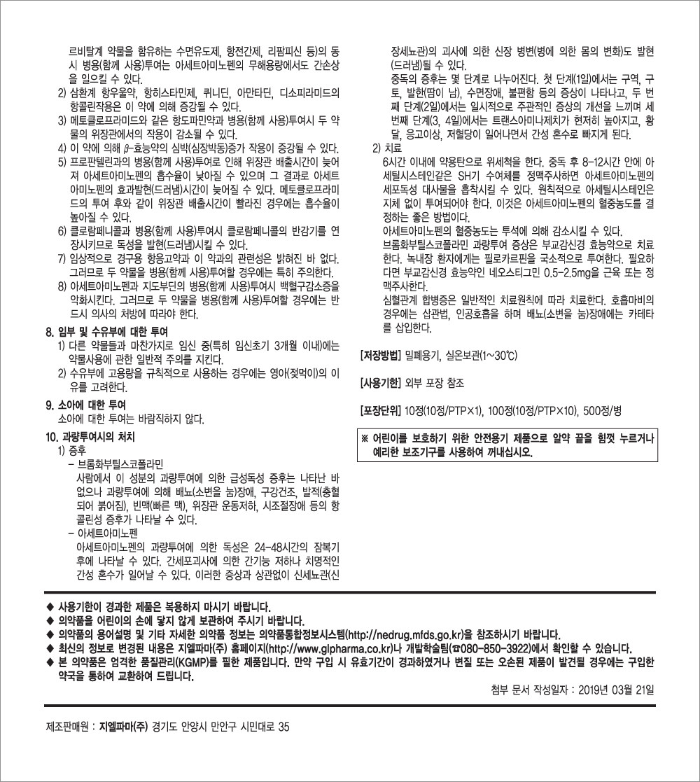 05) 바르비탈계 약물, 삼환계 항우울약 및 알코올을 투여한 환자는 다량의 아세트아미펜을 대사시키는 능력이 감소되어 아세트아미노펜의 혈장반감기를 증가시킬 수 있다. 알코올은 아세트아미노펜 과량투여의 간독성을 증가시킬 수 있다.