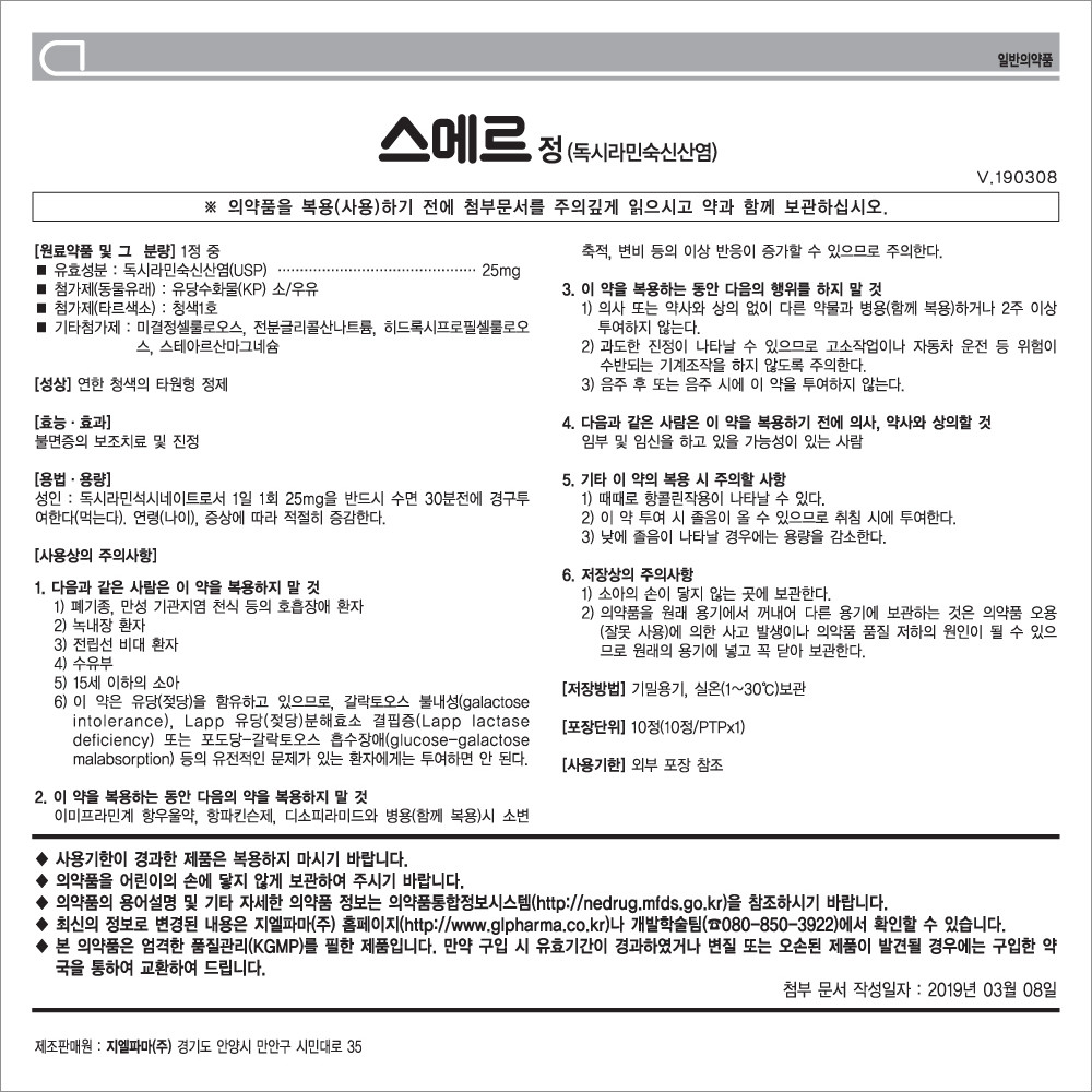 성인 : 독시라민석시네이트로서 1일 1회 25mg을 반드시 수면 30분전에 경구투여한다. 연령 ,증상에 따라 적절히 증감한다.